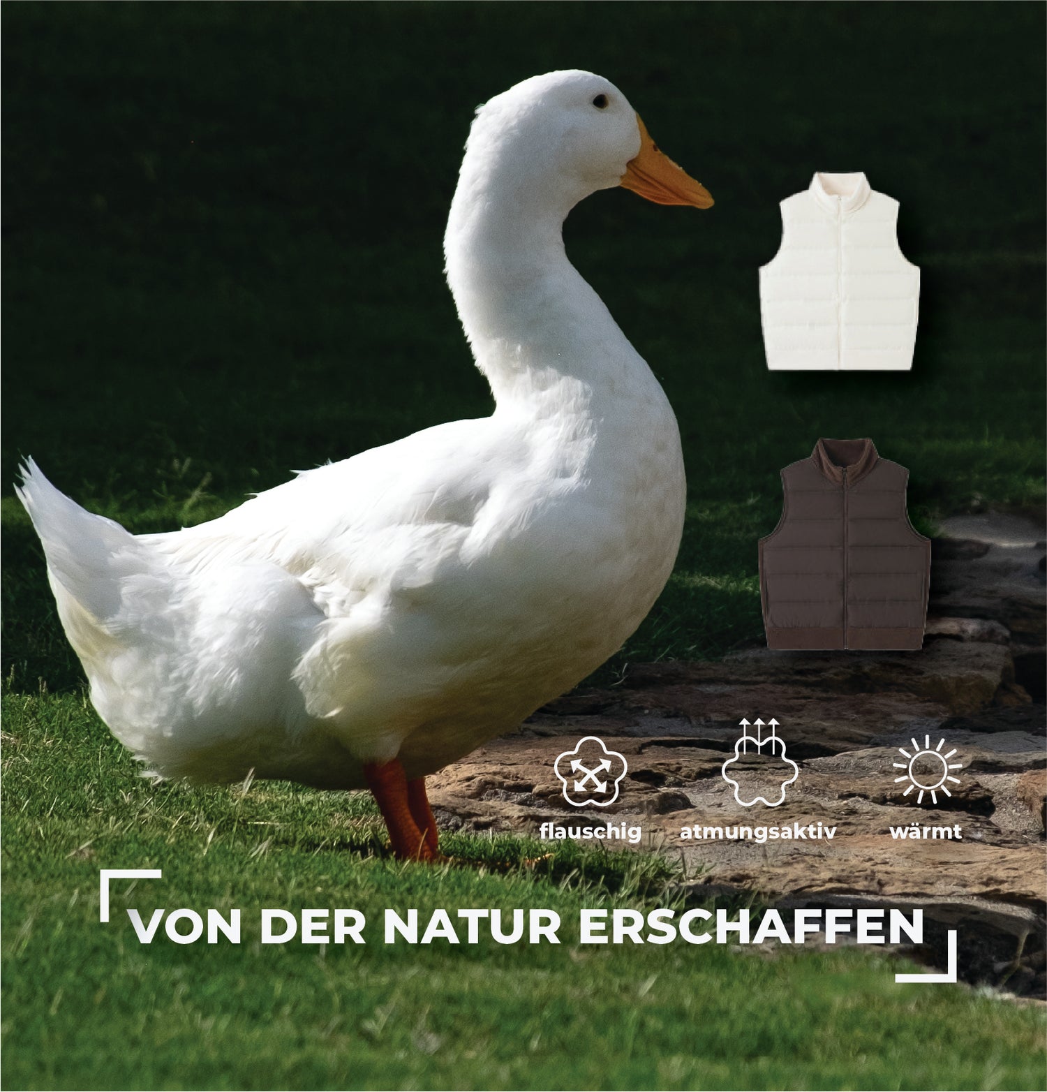 NTW verwendet ethisch gewonnenes, freilaufendes Entendaunen, die ausschließlich aus dem Brust- und Bauchbereich ausgewachsener Weißenten stammen und dadurch besonders weich, atmungsaktiv und wärmend sind. Unsere Daunen stammen von langjährigen familiengeführten Farmen in Ungarn, wo die Tiere verantwortungsvoll in der natürlichen Umgebung des Donautals aufgezogen werden. Rein, hochwertig und von Natur aus isolierend – ein Material, das wirklich von der Natur geschaffen ist.